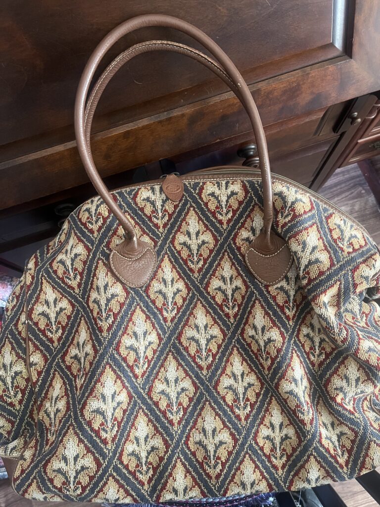 そこに、30年前に購入したローラアシュレイの織りバッグを合わせて。